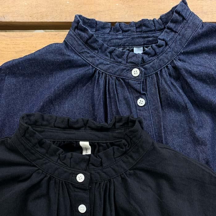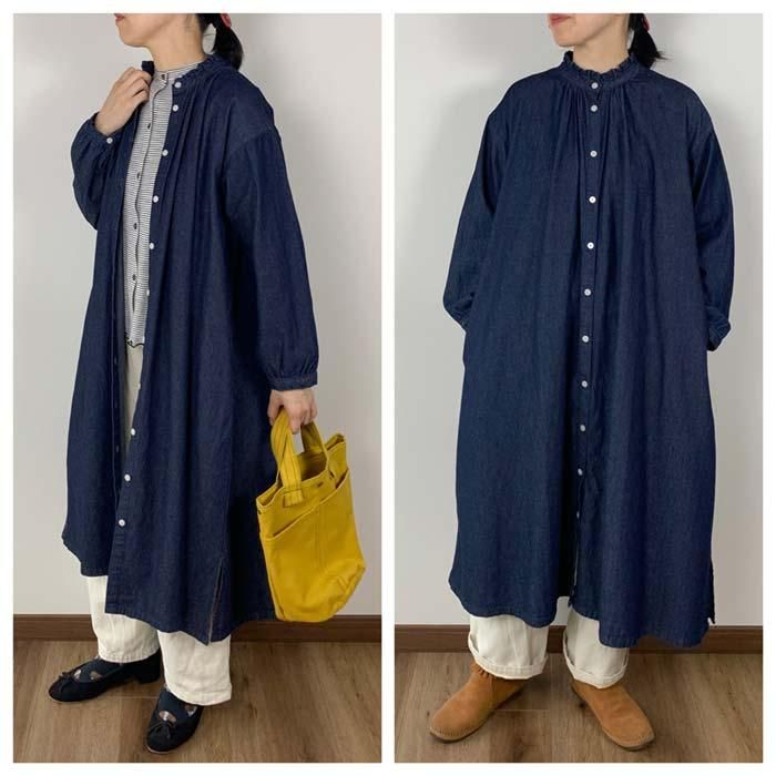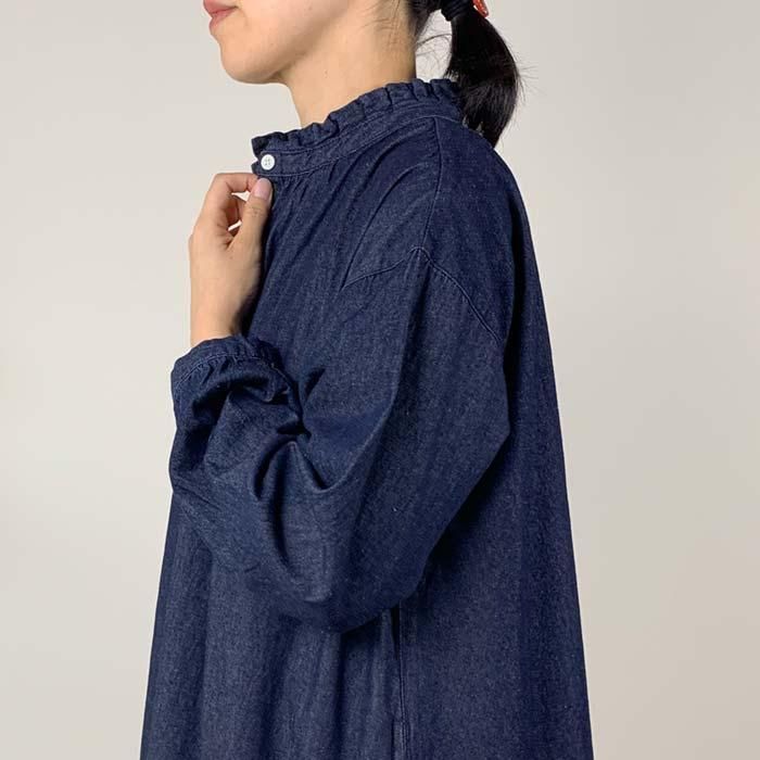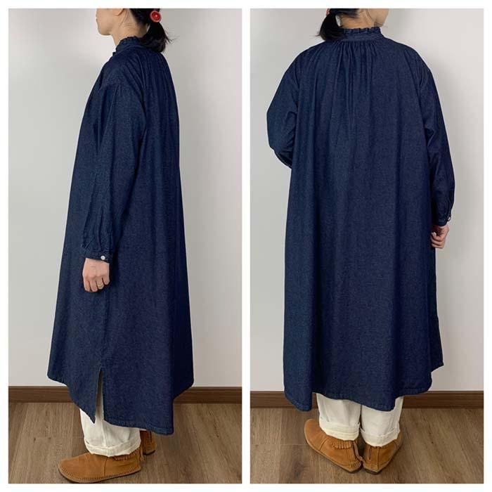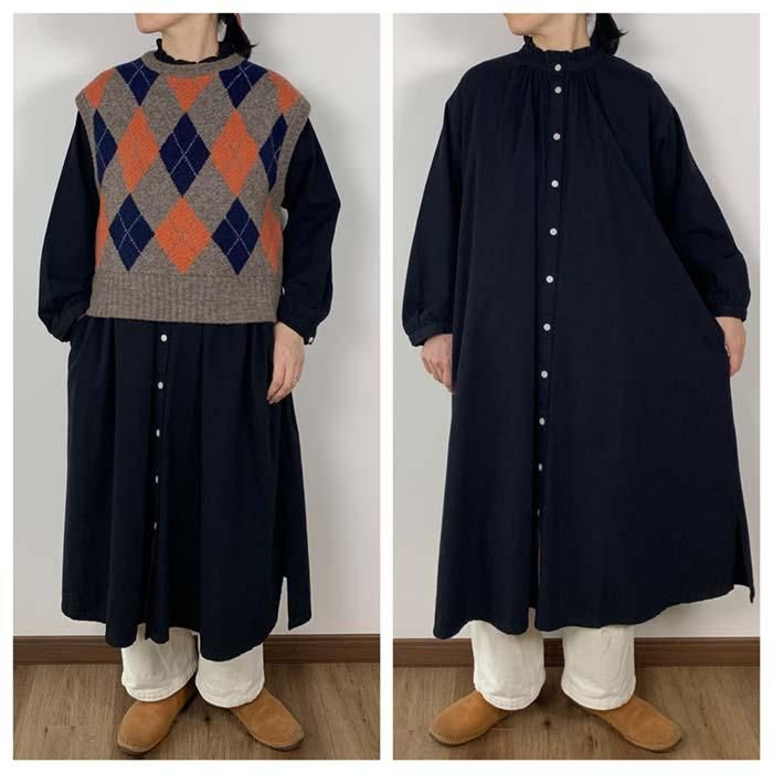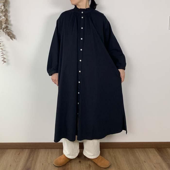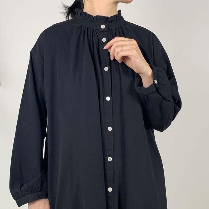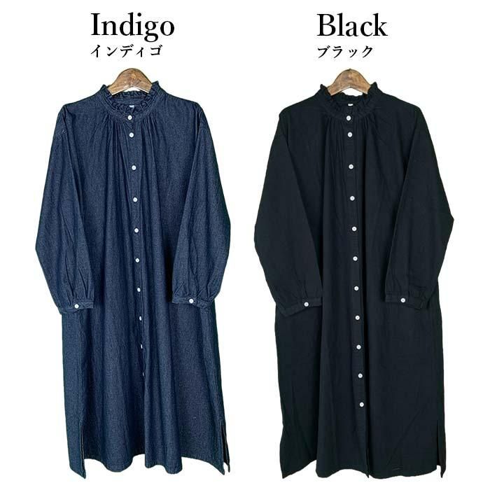 NOP1980 タックフリルネック前開きワンピース Cloud nine クラウドナイン ワンピース チュニック無地 シンプル ベーシック 定番綿100 コットン100ブルー 青ブラック 黒オールシーズン春 春物秋 秋物長袖ロング ロング丈ゆったり リラックスレディースナチュラル 人気 新作 新着定番ギフト プレゼント お祝い冬 冬物